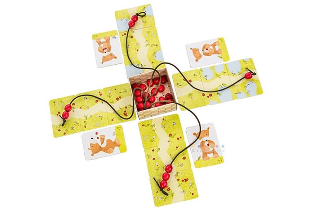 В игре два вида карточек: «Сбор ягод» и «Делимся ягодами». В первом случае нужно нанизывать какое-то количество на свою нитку, а во втором — вычитать, то есть отдавать. В процессе нужно пересчитывать ягодки и сравнивать.