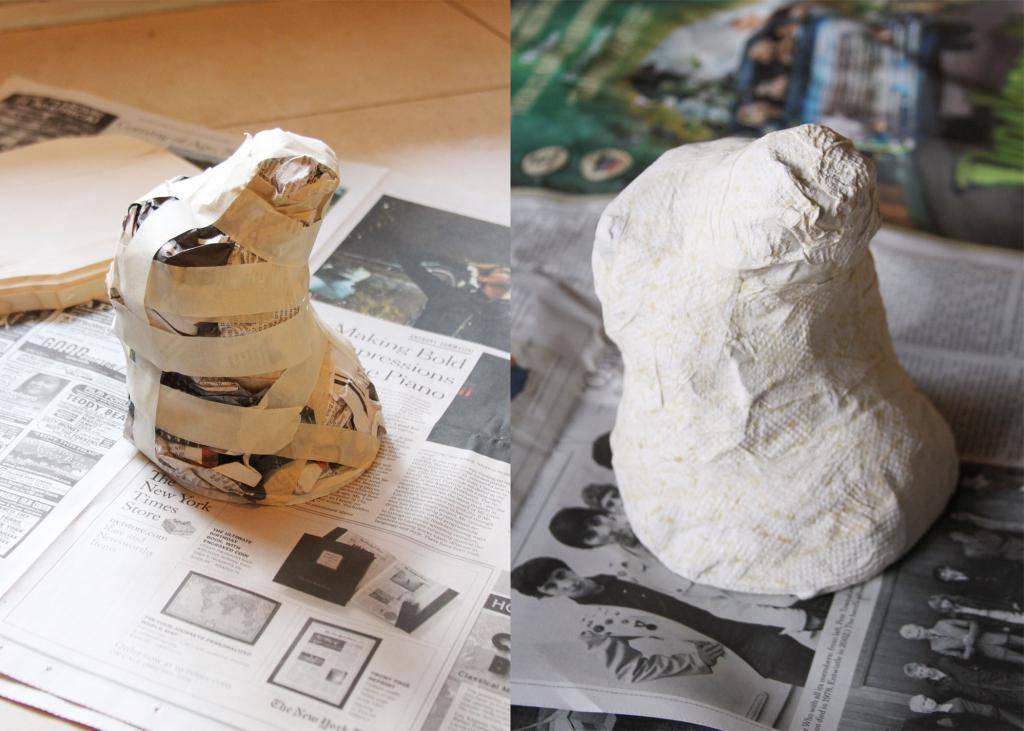 Больших персонажей удобнее делать именно из папье-маше. Нужно подготовить туалетную бумагу или тонкую газету, порвать на средние кусочки и положить в глубокую миску. Затем в емкость добавьте клей ПВА и смешайте с бумагой. Пластиковую бутылку (0,5 л) облепите кусочками бумаги. Предварительно рабочую зону нужно застелить полиэтиленом или клеенкой. Пригодится и фартук.