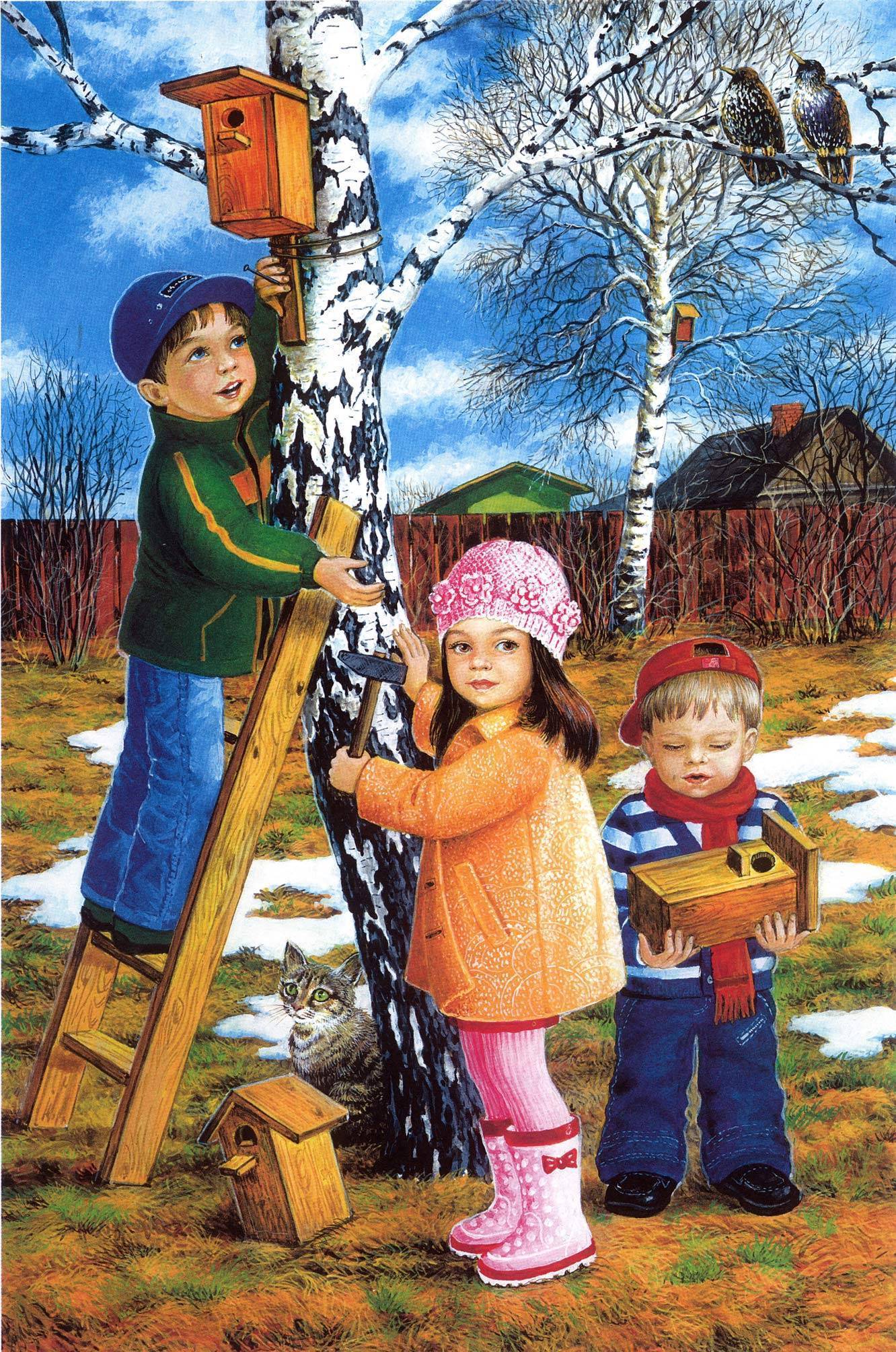Ребята вместе вешают скворечник, в который уже спешат вернувшиеся из тёплых краёв ласточки