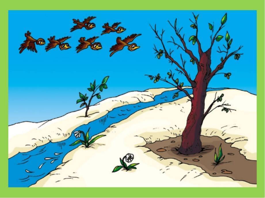 Солнце, первые цветы, возвращение перелётных птиц и другие признаки весны на этой детской картинке
