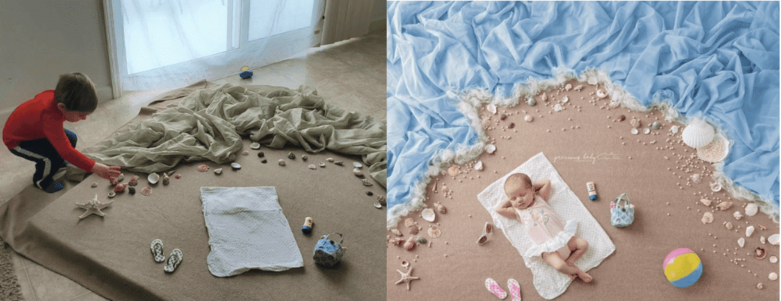 Попросите старших детей нарисовать рисунок, который станет сюжетом для фотосессии их братика или сестренки. А затем вместе с ним воссоздайте эту картину на полу. Поверьте – это будет шедеврально!