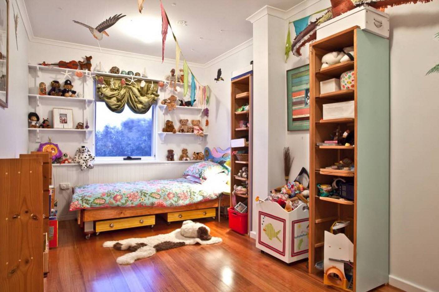 Хранение в детской комнате требует много продуманного подхода и должно быть учтено на ранних этапах планирования детской. Регулируемый стеллаж обязателен для дизайна. Он может адаптироваться к книгам, картинам, портретам, сувенирам, когда игрушки остаются позади. Разумеется, он должен быть основательно закреплен на стене и доступен — все недоступное не будет использовано.