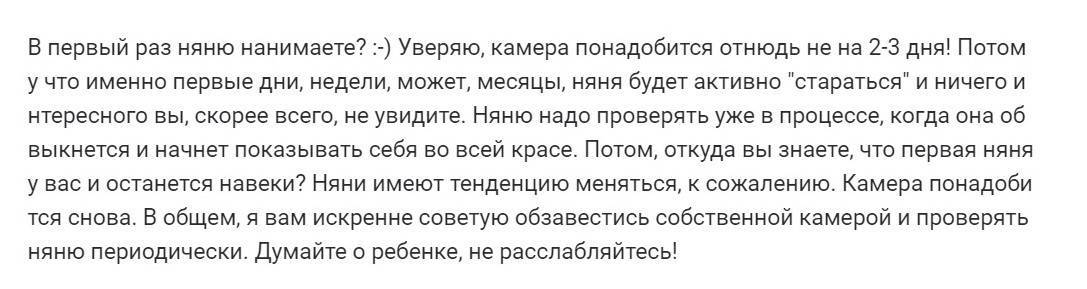 Своими отзывами и советами делятся и другие мамы на форумах. С появлением камер в доме они стали гораздо меньше переживать за безопасность ребенка, который остался на попечении няни.