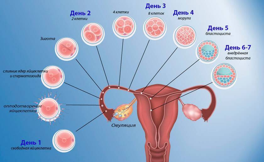 После слияния сперматозоида с женской половой клеткой образовавшаяся зигота движется к матке. Через 24 часа начинается процесс дробления, приводящий к образованию на 5-е сутки бластоцисты, состоящей примерно из 100 клеток. На 8-й день бластоциста внедряется в маточный эндометрий.