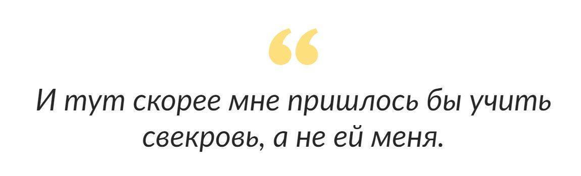 — Меня раздражало, что свекровь указывает мне, как готовить, но психолог предложила мне посмотреть на это иначе — она считает свой опыт полезным. Тогда я решила использовать ее рвение во благо: я не люблю закатывать огурцы и помидоры, а она как раз любит — я направила ее старания в это русло, там она может проявить мастерство.
