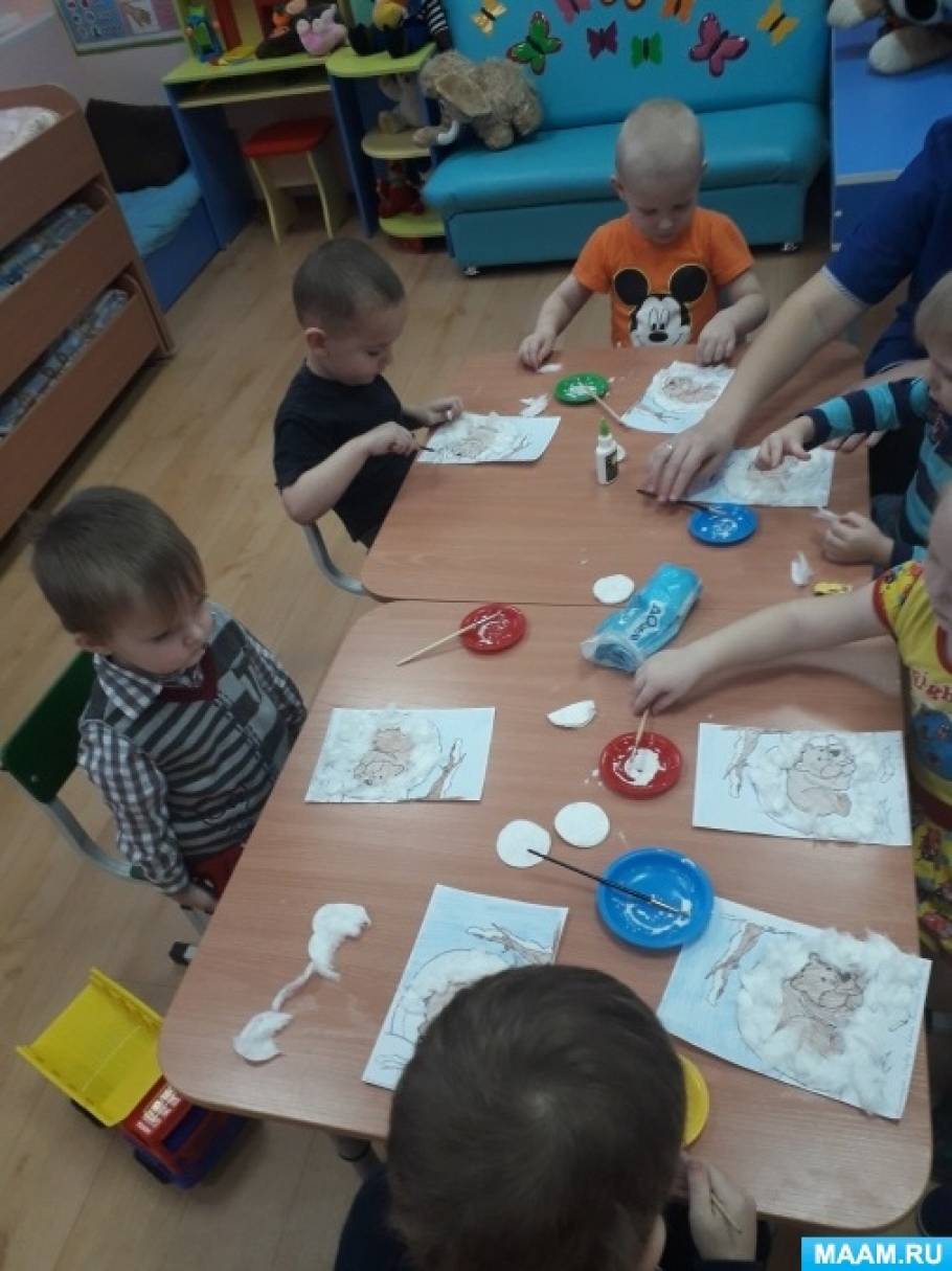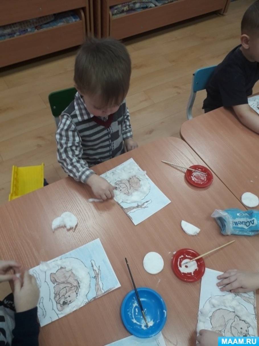 С помощью ваты и клея дети, занимающиеся в средней группе, сделают не только мех медведю, но и берлогу для него. Также из ватных шариков получится «удобная» льдина, на которой с удовольствием разместится бумажный медведь.