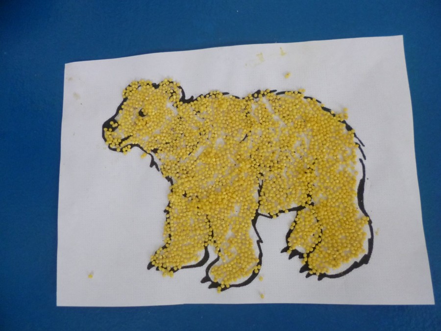 - скатать из кусочков ваты неплотные шарики и обклеить ими голову мишки, ориентируясь на края берлоги, приклеить сугробы;