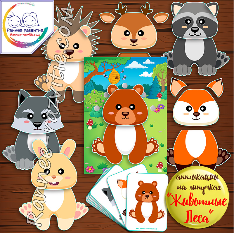 Два листа цветного картона необходимо склеить между собой, чтобы получился лист размером побольше. По шаблонам детки должны вырезать из цветной бумаги фигурки медведя, ежа, зайца, лисицы и других лесных зверей и расположить их на картонном фоне. Фон можно дополнительно задекорировать, приклеив на него травку из зеленой бумаги, солнышко, цветы и так далее.
