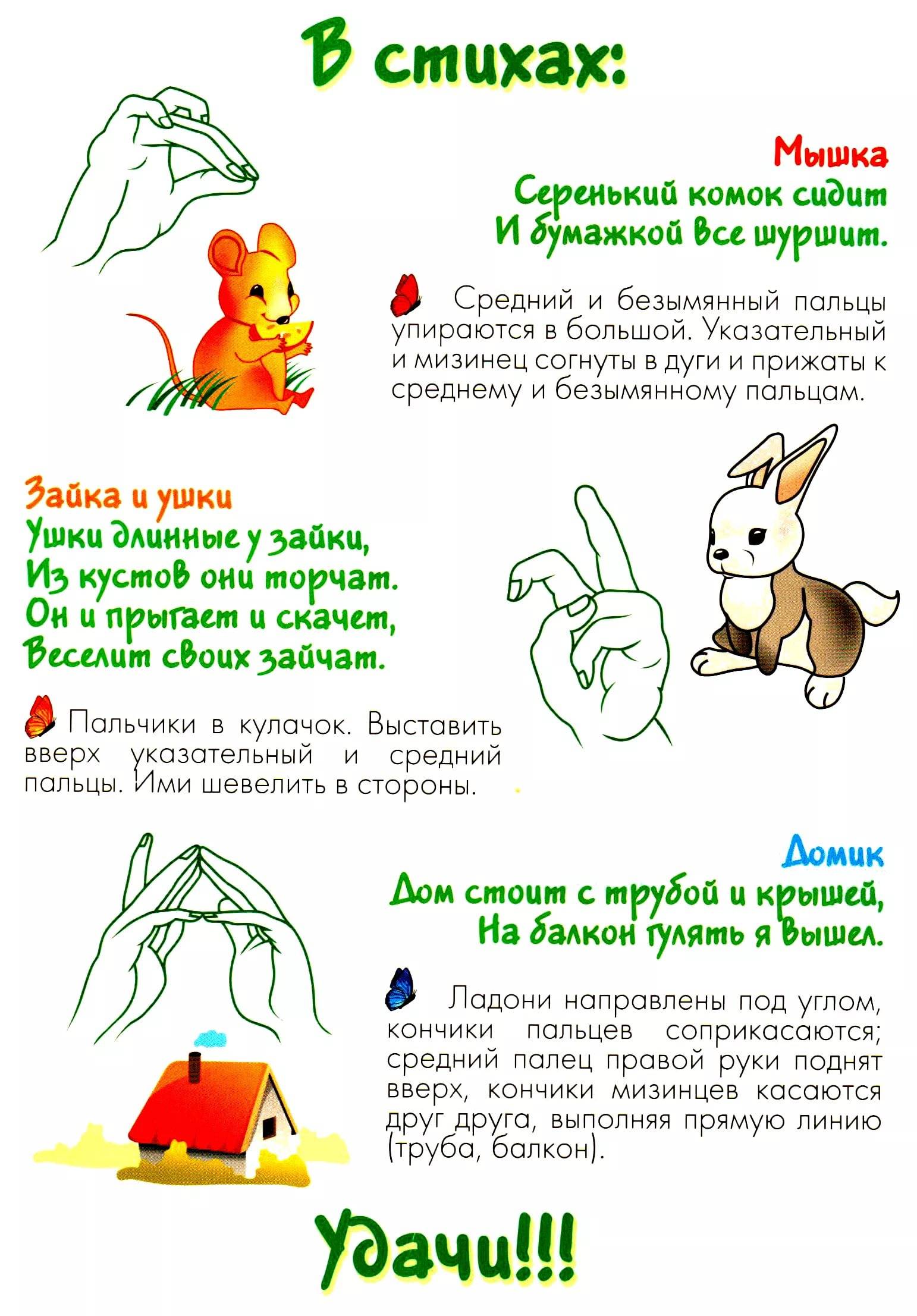 Пальчиковая гимнастика проводится в игровой форме. Преподаватель зачитывает стихи, под них ребенок показывает движения пальчиками. При этом пальцы 2 рук должны действовать синхронно, в паре. С каждым упражнением нагрузка должна повышаться. После проведенного задания руки ребенка должны отдохнуть, чтобы снять напряжение и подготовить их к новым действиям.