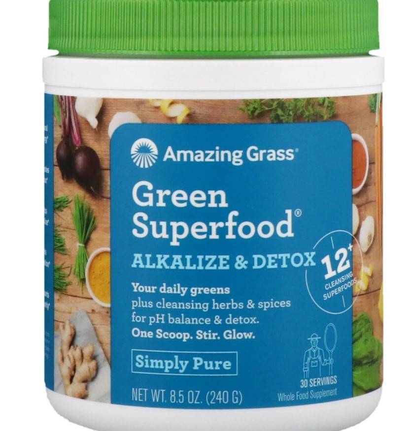 - Green Superfood, 240 г. Добавка, предназначенная для снижения кислотности и выведения токсинов. Достичь эффекта помогают входящие в состав препарата имбирь, куркума, перечная мята, петрушка, семена фенхеля, алоэ, цедра лимона, чеснок, корень одуванчика. Принимать по мерной ложке, разведенной в стакане воды (подойдет также сок или смузи). Стоимость препарата порядка 2200 рублей.
