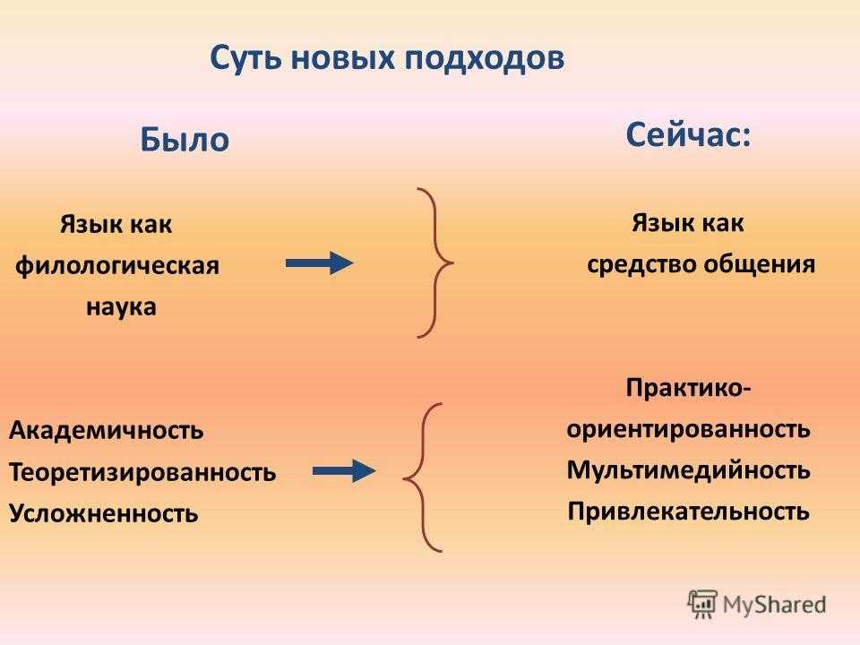 Суть новых подходов Было Язык как филологическая наука Академичность Теоретизированность Усложненность Сейчас: Язык как средство общения Практико- ориентированность Мультимедийность Привлекательность