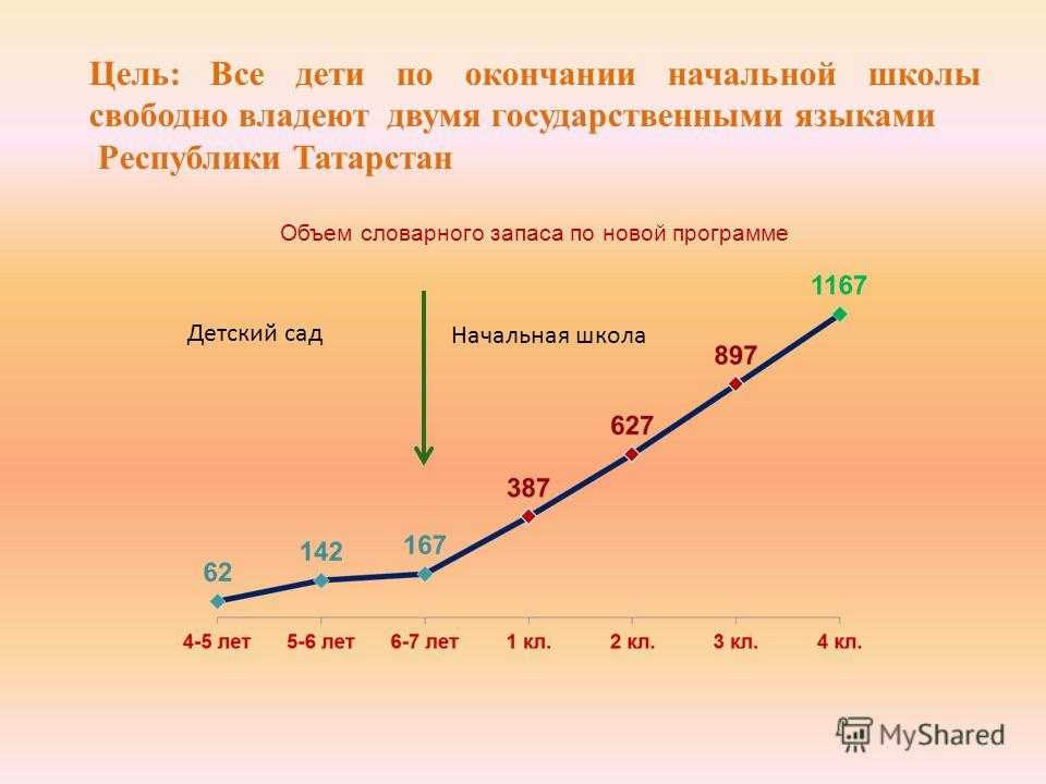 Цель: Все дети по окончании начальной школы свободно владеют двумя государственными языками Республики Татарстан Объем словарного запаса по новой программе Детский сад Начальная школа