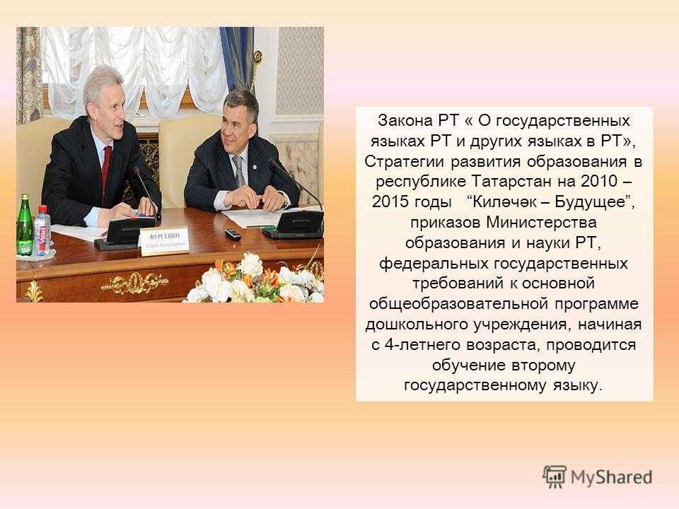 Закона РТ « О государственных языках РТ и других языках в РТ», Стратегии развития образования в республике Татарстан на 2010 – 2015 годы Киләчәк – Будущее, приказов Министерства образования и науки РТ, федеральных государственных требований к основной общеобразовательной программе дошкольного учреждения, начиная с 4-летнего возраста, проводится обучение второму государственному языку.