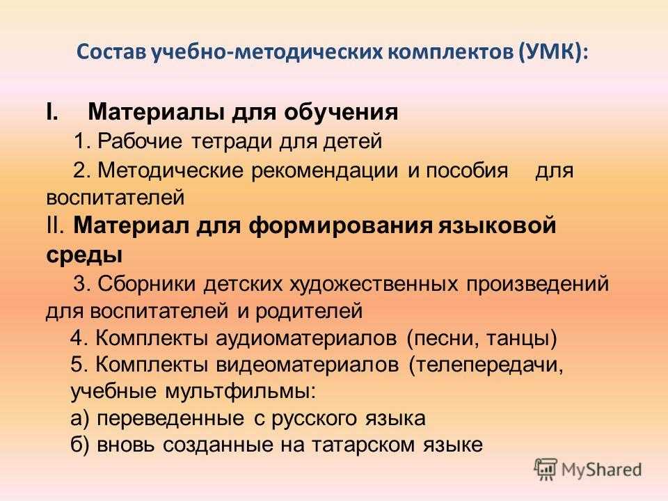 Состав учебно-методических комплектов (УМК): I.Материалы для обучения 1. Рабочие тетради для детей 2. Методические рекомендации и пособия для воспитателей II. Материал для формирования языковой среды 3. Сборники детских художественных произведений для воспитателей и родителей 4. Комплекты аудиоматериалов (песни, танцы) 5. Комплекты видеоматериалов (телепередачи, учебные мультфильмы: а) переведенные с русского языка б) вновь созданные на татарском языке
