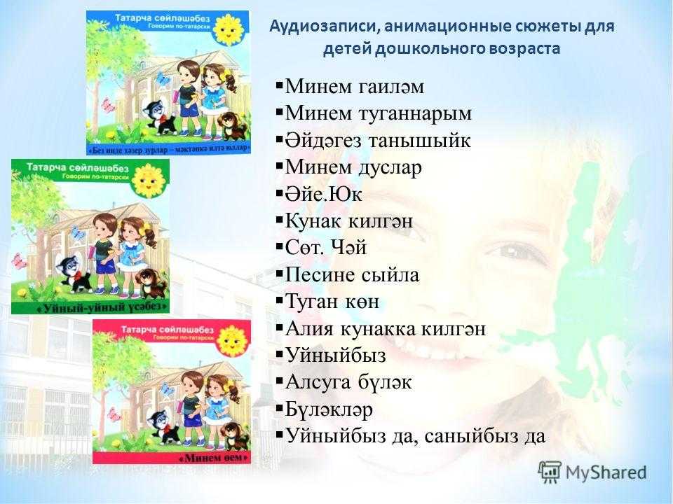 Аудиозаписи, анимационные сюжеты для детей дошкольного возраста Минем гаиләм Минем туганнарым Әйдәгез танышыйк Минем дуслар Әйе.Юк Кунак килгән Сөт. Чәй Песине сыйла Туган көн Алия кунакка килгән Уйныйбыз Алсуга бүләк Бүләкләр Уйныйбыз да, саныйбыз да