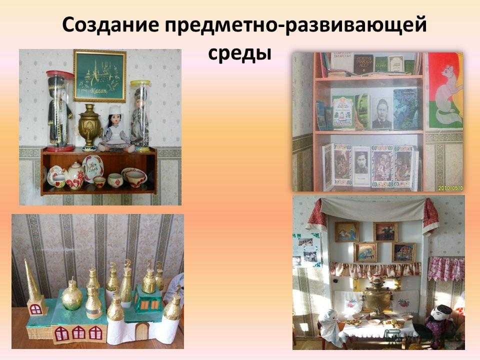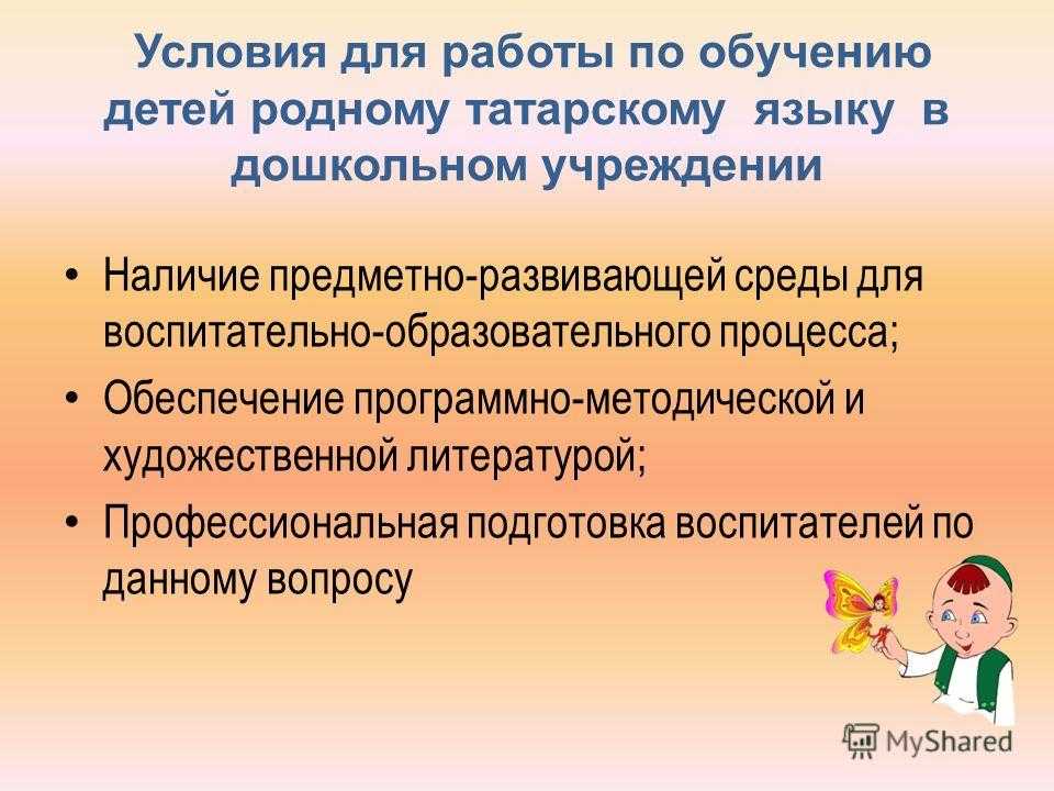 Условия для работы по обучению детей родному татарскому языку в дошкольном учреждении Наличие предметно-развивающей среды для воспитательно-образовательного процесса; Обеспечение программно-методической и художественной литературой; Профессиональная подготовка воспитателей по данному вопросу
