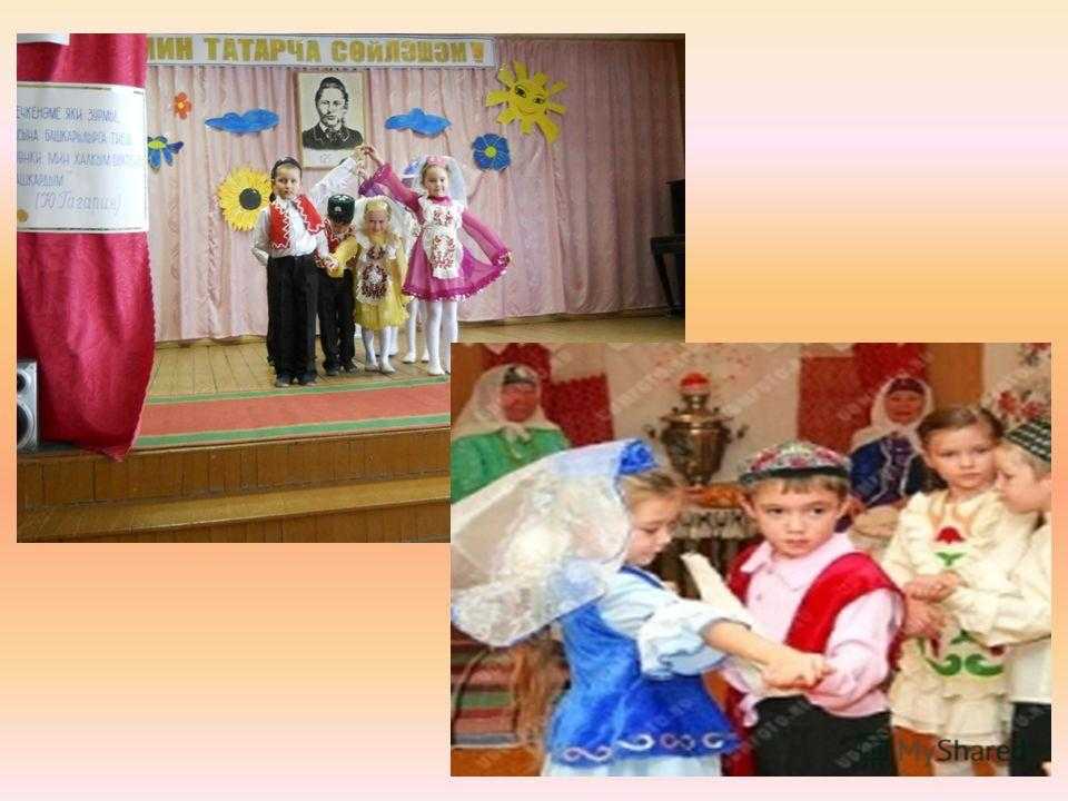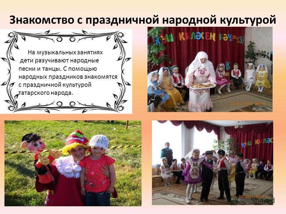 Знакомство с праздничной народной культурой На музыкальных занятиях дети разучивают народные песни и танцы. С помощью народных праздников знакомятся с праздничной культурой татарского народа.