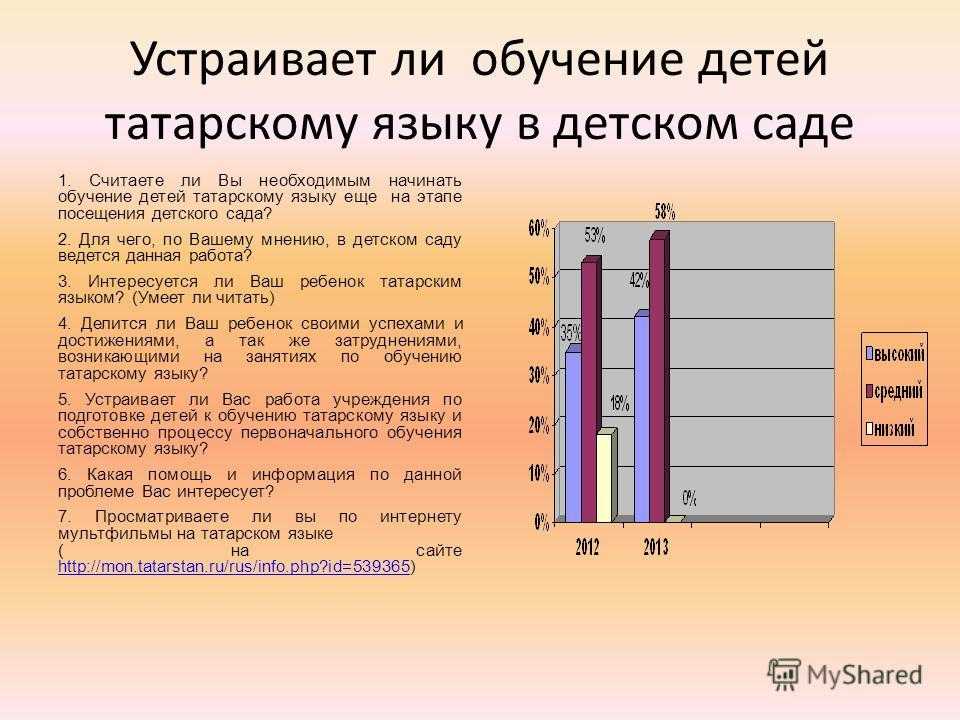 Устраивает ли обучение детей татарскому языку в детском саде 1. Считаете ли Вы необходимым начинать обучение детей татарскому языку еще на этапе посещения детского сада? 2. Для чего, по Вашему мнению, в детском саду ведется данная работа? 3. Интересуется ли Ваш ребенок татарским языком? (Умеет ли читать) 4. Делится ли Ваш ребенок своими успехами и достижениями, а так же затруднениями, возникающими на занятиях по обучению татарскому языку? 5. Устраивает ли Вас работа учреждения по подготовке детей к обучению татарскому языку и собственно процессу первоначального обучения татарскому языку? 6. Какая помощь и информация по данной проблеме Вас интересует? 7. Просматриваете ли вы по интернету мультфильмы на татарском языке ( на сайте