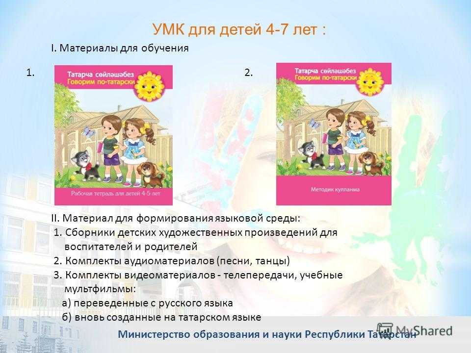 Министерство образования и науки Республики Татарстан УМК для детей 6-7 лет : I. Материалы для обучения II. Материал для формирования языковой среды: 1. Сборник детских художественных произведений для воспитателей и родителей 2. Комплекты аудиоматериалов (песни, танцы) 3. Комплекты видеоматериалов — телепередачи, учебные мультфильмы: а) переведенные с русского языка б) вновь созданные на татарском языке 1. 2.