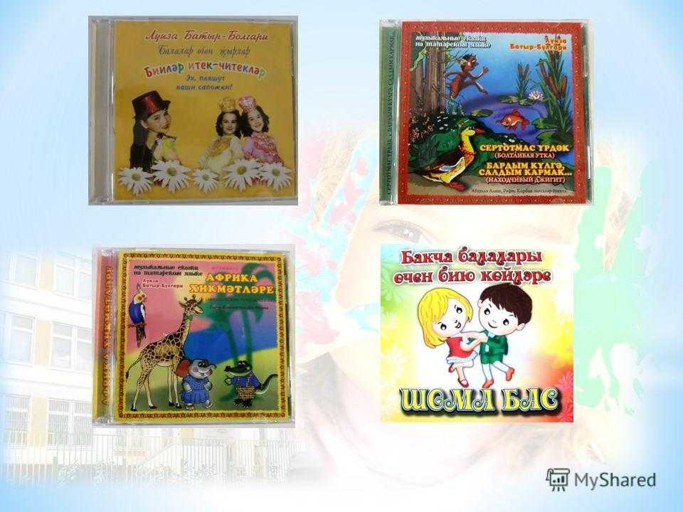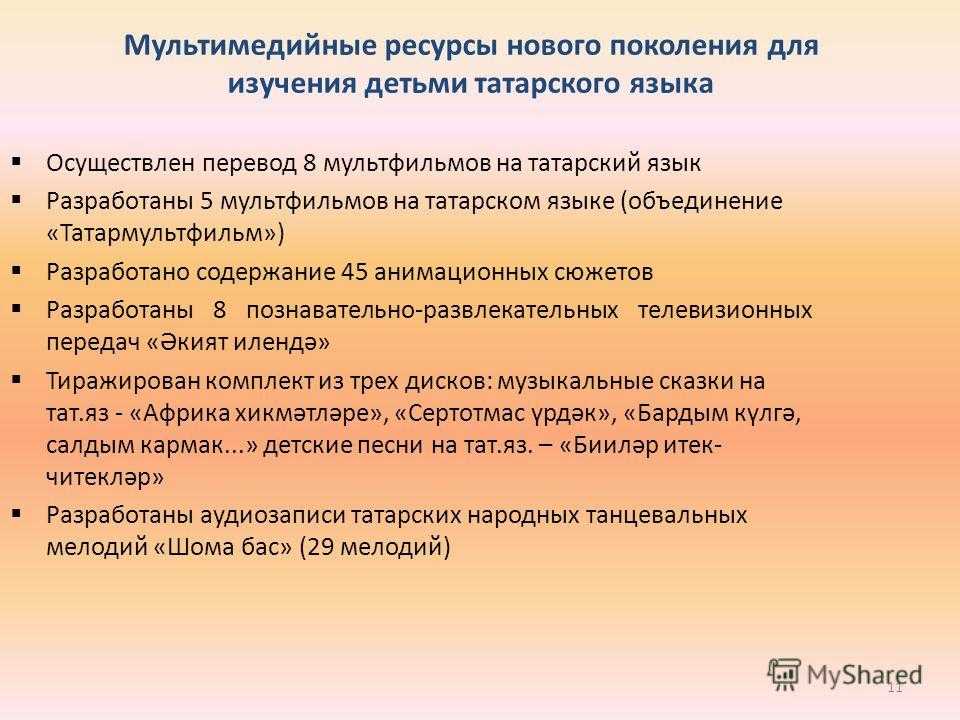 Осуществлен перевод 8 мультфильмов на татарский язык Разработаны 5 мультфильмов на татарском языке (объединение «Татармультфильм») Разработано содержание 45 анимационных сюжетов Разработаны 8 познавательно-развлекательных телевизионных передач «Әкият илендә» Тиражирован комплект из трех дисков: музыкальные сказки на тат.яз — «Африка хикмәтләре», «Сертотмас үрдәк», «Бардым күлгә, салдым кармак…» детские песни на тат.яз. – «Бииләр итек- читекләр» Разработаны аудиозаписи татарских народных танцевальных мелодий «Шома бас» (29 мелодий) 11 Мультимедийные ресурсы нового поколения для изучения детьми татарского языка
