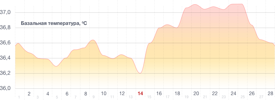 В первые дни менструального цикла базальная температура держится примерно на одном и том же уровне. За день до овуляции она понижается на доли градуса, а в главный для будущей беременности день — возрастает, причем выше уровня начала цикла