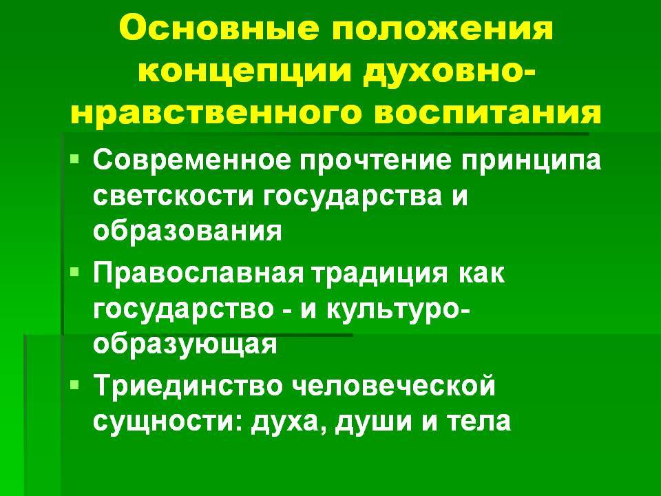 Главная цель концепции — раскрыть принципы и пути воспитания высоконравственной личности путем формирования у нее основных ценностей, духовных ориентиров и убеждений. Согласно концепции, деятельность школы должна быть направлена на формирование сознательного гражданина и воспитание патриота.