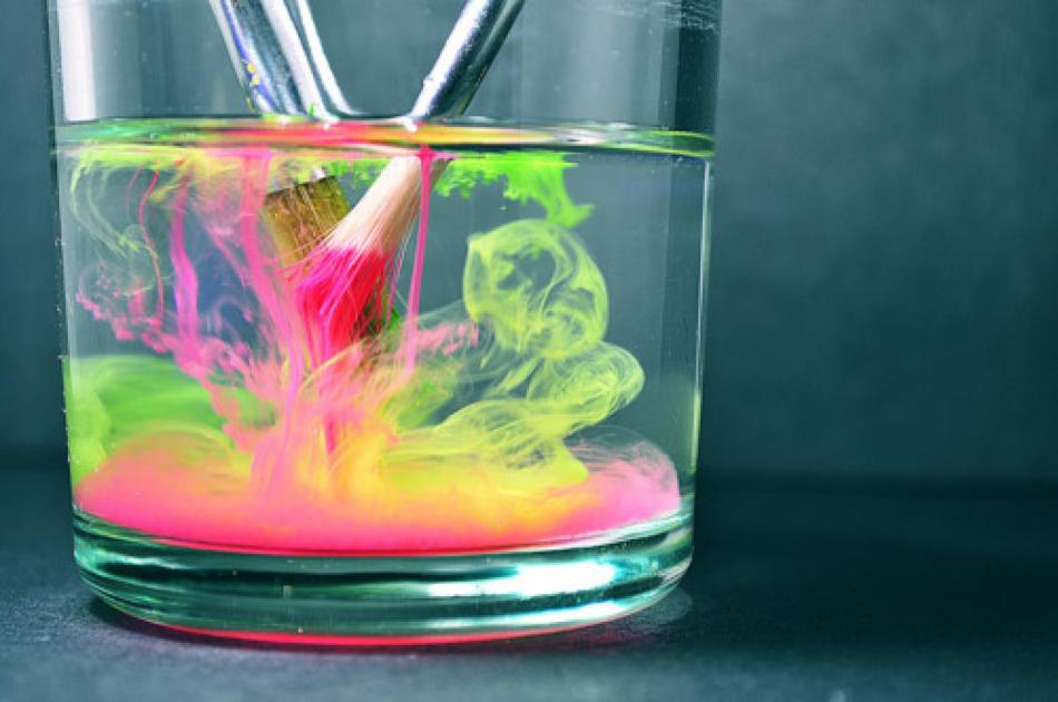 - Тут же добавляем в один из стаканов синюю краску и наблюдаем изменения