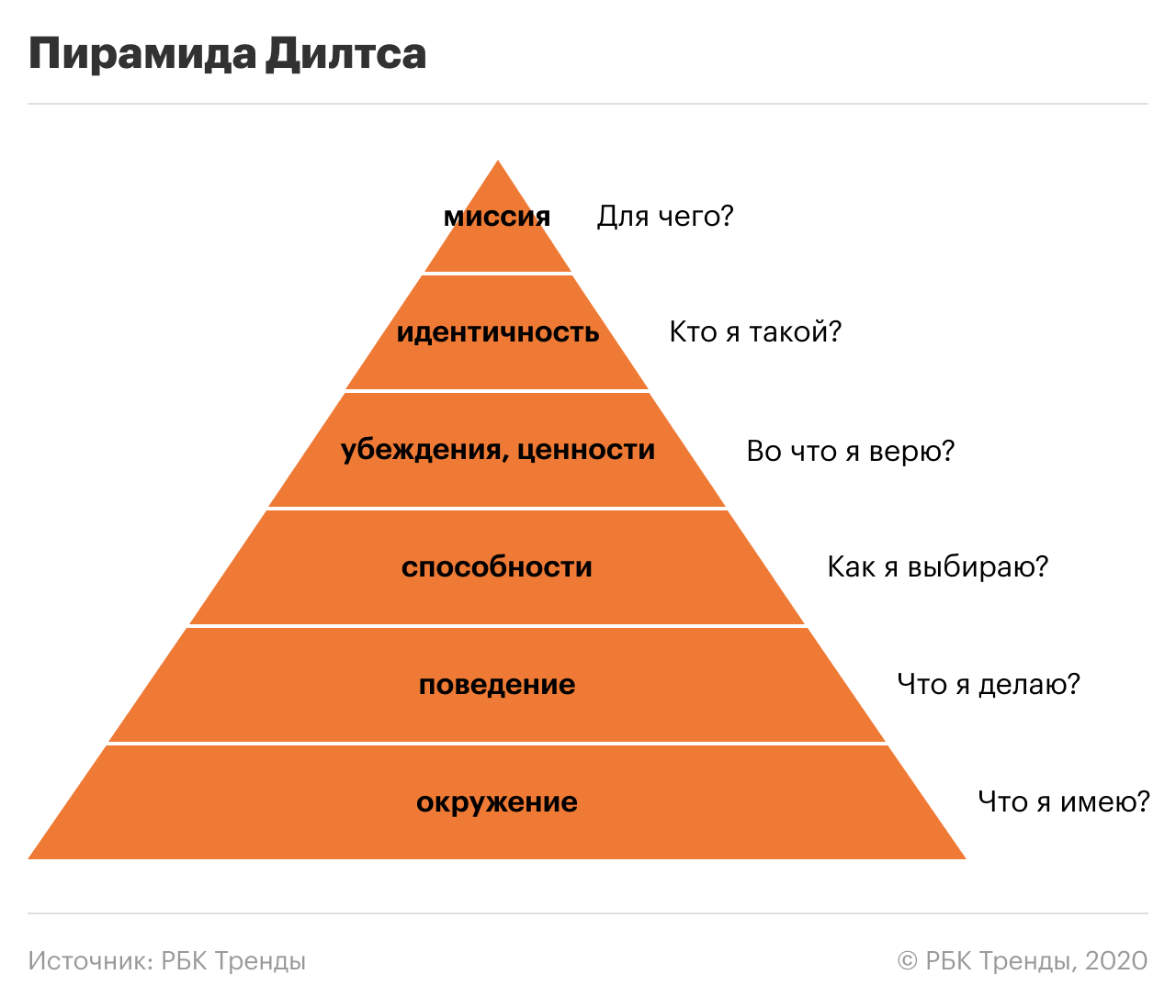 Один из учебных методов, который поможет правильно прицелиться — это «Пирамида Дилтса». Она включает в себя шесть уровней целеполагания: окружение, поведение, способности, убеждения/ценности, идентичность, миссия. Определите проблему, которую вы хотите решить и уровень в пирамиде, которому она соответствует. Решение проблемы как правило находится на один-два уровня выше