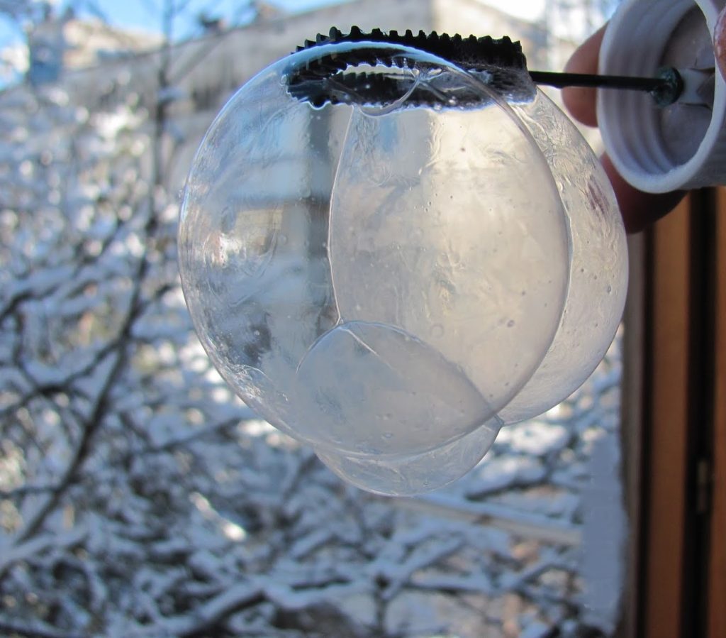 Не самое очевидное развлечение – это выдувание мыльных пузырей на морозе. При этом, чем больше мороз, тем быстрее замерзает мыльный пузырь и прямо на ваших глазах поверхность покрывается тоненькой корочкой льда. И вот вы уже с малышом можете любоваться причудливыми узорами и даже попробовать взять ледяной шарик в руки. А после прогулки дома ребенку вполне возможно захочется нарисовать в альбоме те узоры, которые он разглядел.