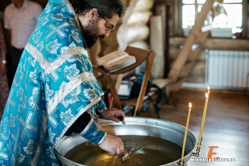 После этого елей и вода для крещения освящаются батюшкой. Чтобы ребёнок мог противостоять дьяволу всю свою жизнь, в помощь ему помазывают елеем грудь, уши, руки и ноги. Лишь затем погружают в купель трижды. Батюшка читает молитвы.