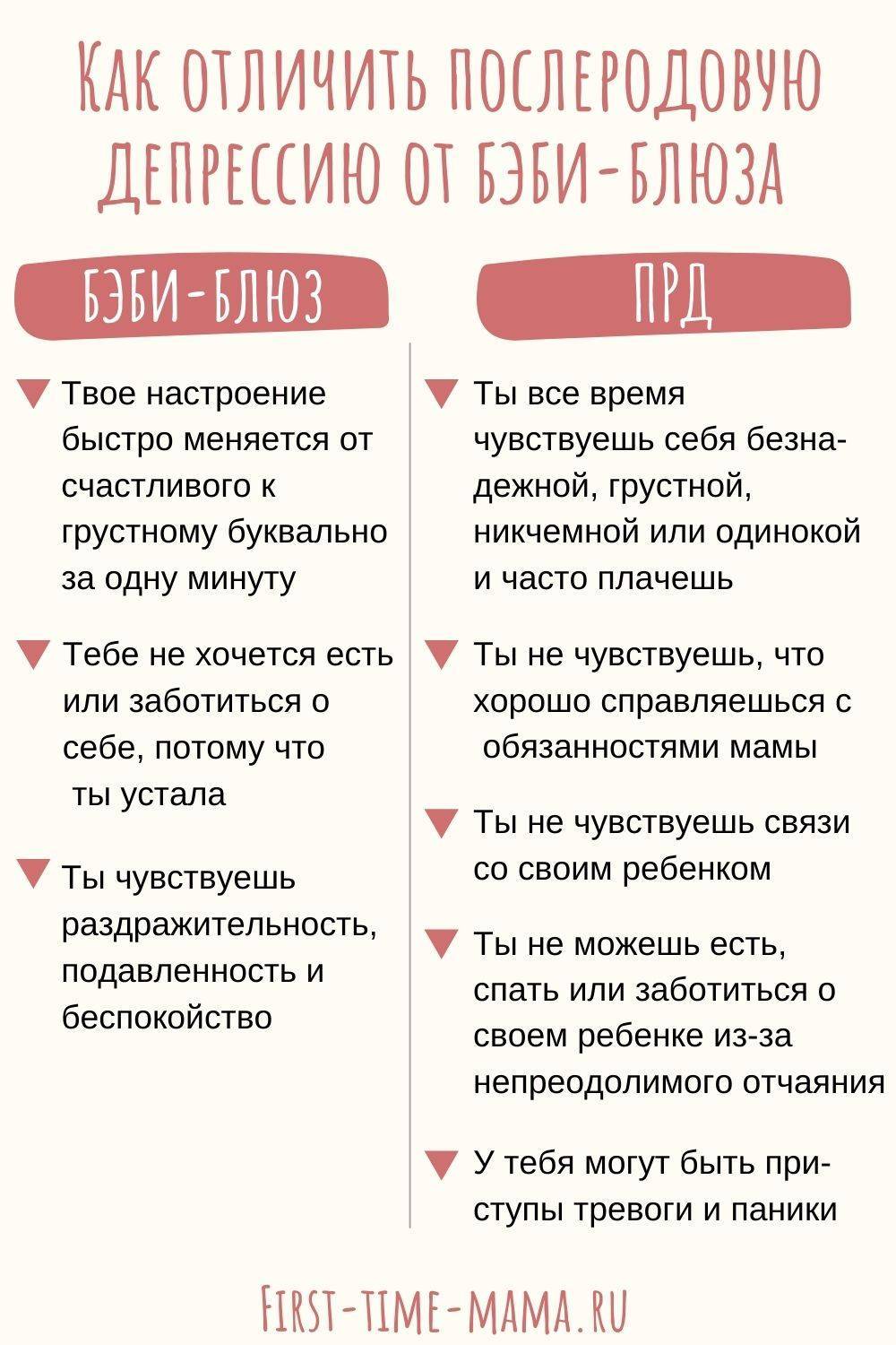 Послеродовую депрессию стоит отличать от грусти и хандры, которые также часто возникают после родов. Разница в интенсивности симптомов и их длительности — симптомы послеродовой депрессии не проходят через несколько недель, причиняют много боли и беспокойств и делают жизнь женщины невыносимой.