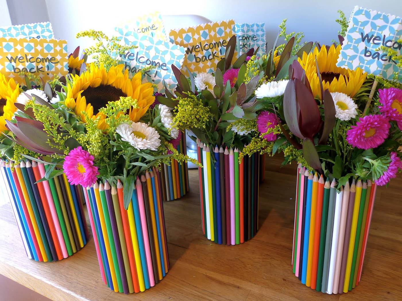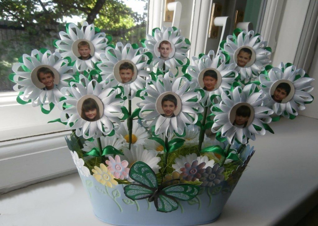 Делается он на основе простого цветочного горшка, который следует оригинально украсить. Например, прикрепить по всей поверхности разноцветные карандаши плотным кольцом. В самом горшке устанавливаем цветочки, сделанные из бумаги. В середине каждого цветочка прикрепляем фотографию ученика. Количество цветов, зависит от числа учеников.