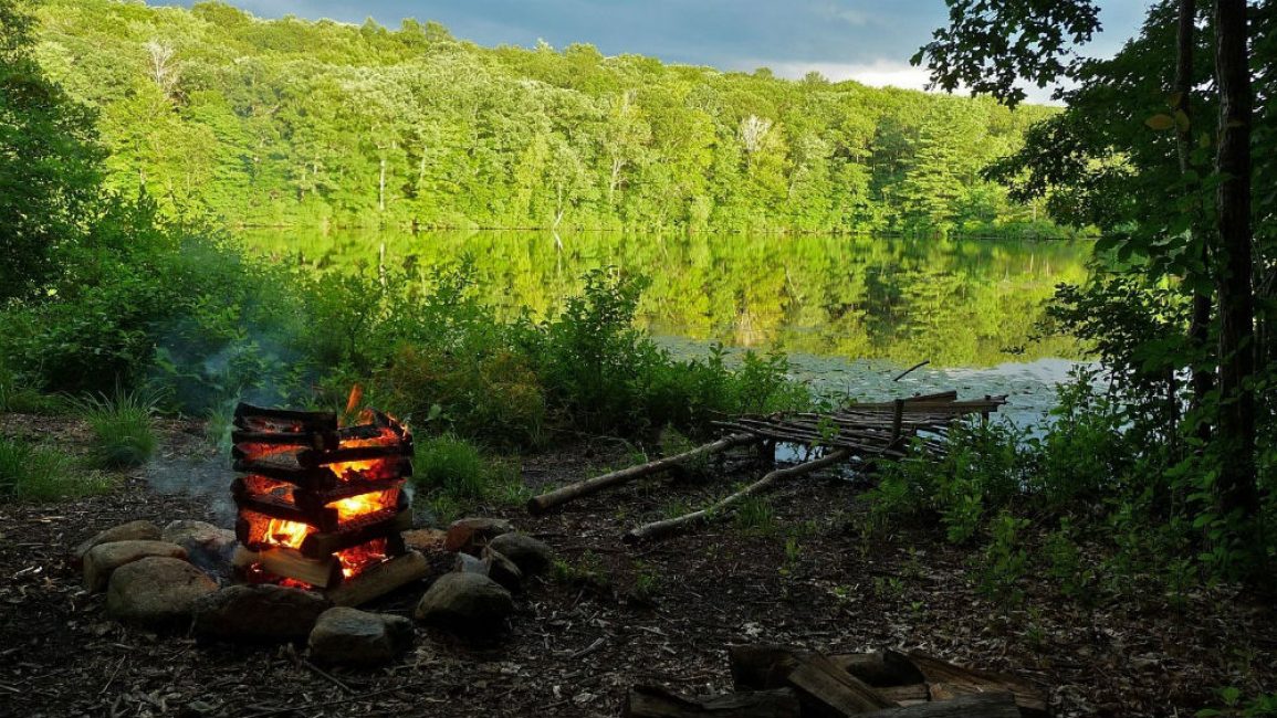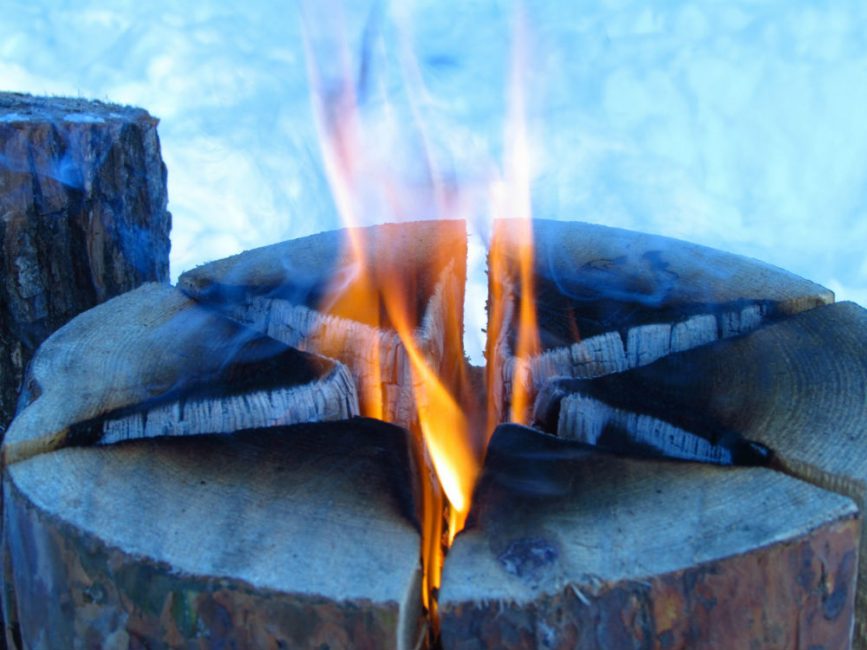 Должен получиться квадрат, а изнутри будет пылать огонь от шалашика. Если дрова вдруг окажутся не сухими, при такой укладке они быстро подсохнут и разгорятся.