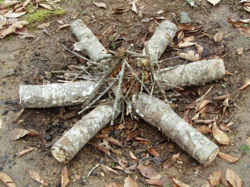 Горение будет происходить в центральной части, не расползаясь за границы. Необходимо уложить толстые ветви в виде лучей, которые из сердцевины уходят в разные направления.