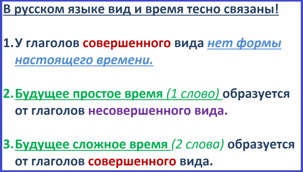 В изъявительном наклонении глаголы несовершенного вида имеют три времени: настоящее, прошедшее и будущее, а глаголы совершенного вида — два времени: прошедшее и будущее простое.