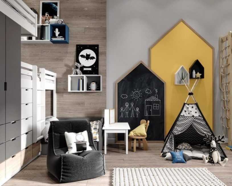 Игровую стоит сделать просторнее. С большой разницей в возрасте можно поставить детям отельные кроватки: маленькому в виде машины-Маккуина, старшему – стандартную, выполненную в строгом стиле или небольшой раскладной диван.