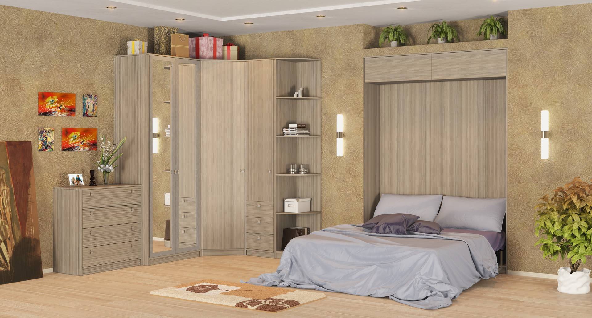 Выбирайте для спальни трансформер с двуспальной откидной кроватью, оснащённой качественным ортопедическим матрасом, по возможности, вместительной и удобной боковой системой хранения. Позаботьтесь о наличии встроенных ночных светильников, удобных полочек, чтобы было куда положить, к примеру, книжку, которую будете читать «на сон грядущий».
