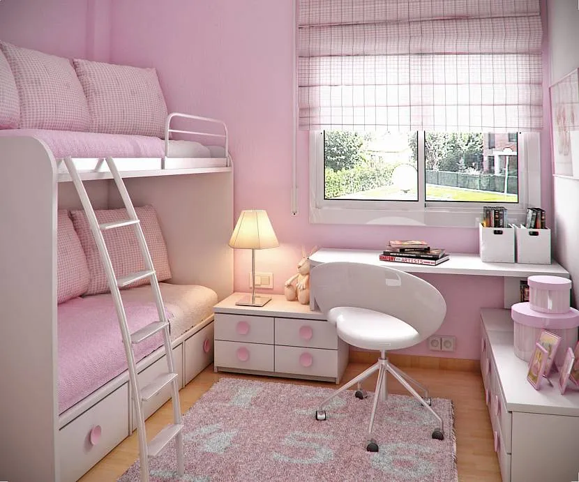 Ниже представлена интересная вариация с двухъярусной кроватью, обеспечивающая девочкам комфортное пространство для отдыха, сна. Подбор цветов логичен: