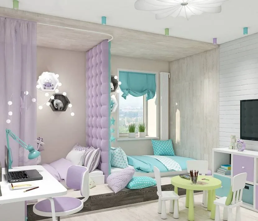 Различия в цветовой гамме. Если мебель и основные элементы декора похожи у обеих сестер, то рекомендуется зонировать помещение с помощью различий в оттенках. Использование разных цветов для оформления пространства позволит отделить одну часть комнаты от другой без перегородок.