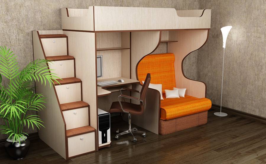 В нестандартных комнатах, чтобы совместить гостиную с детской, нужна компактная многофункциональная мебель.
