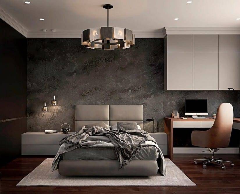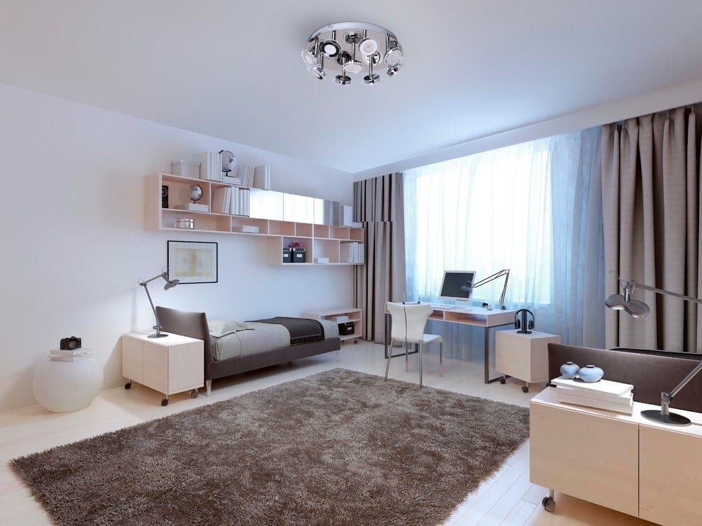 С учетом функционала помещения, следует особенно внимательно отнестись к его меблировке. Обязательными атрибутами данной спальни является кровать, рабочий стол с креслом или стулом и шкаф.