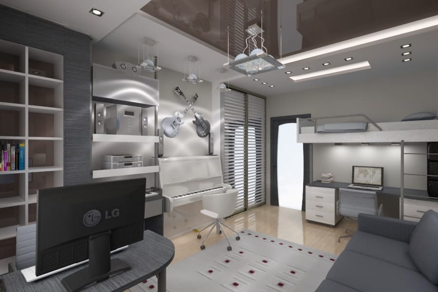 Если ваш ребенок музыкант, художник или спортсмен, то комната в стиле лофт непременно придется ему по душе. В лофт хорошо впишется пластиковая мебель с глянцевыми фасадами в сочетании с мягким диваном и стеклянным журнальным столом.