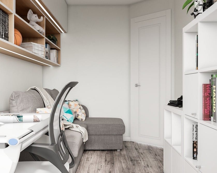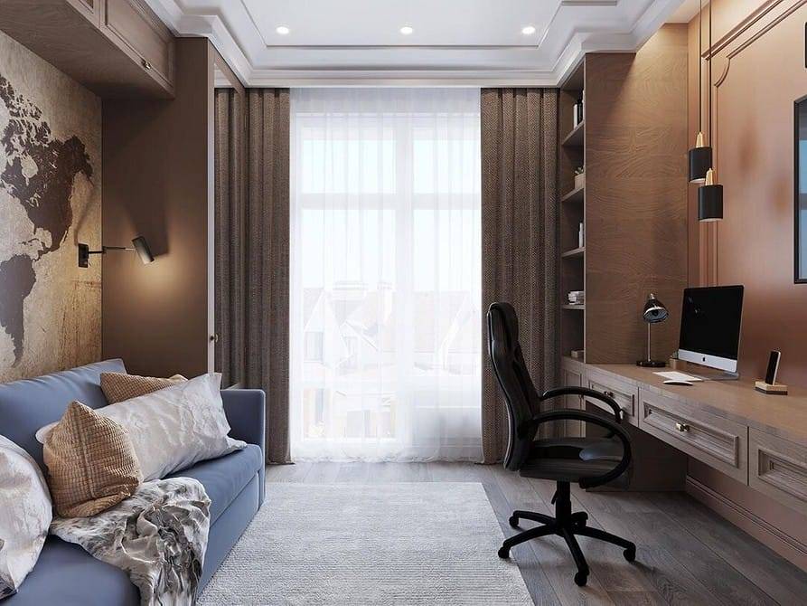 Для рабочей зоны также важно позаботиться о качественном освещении и грамотном падении света. . При достаточном количестве пространства, возможна установка книжного шкафа и подвесных полочек, в малогабаритном помещении лучше отдать предпочтение встроенным купейным моделям