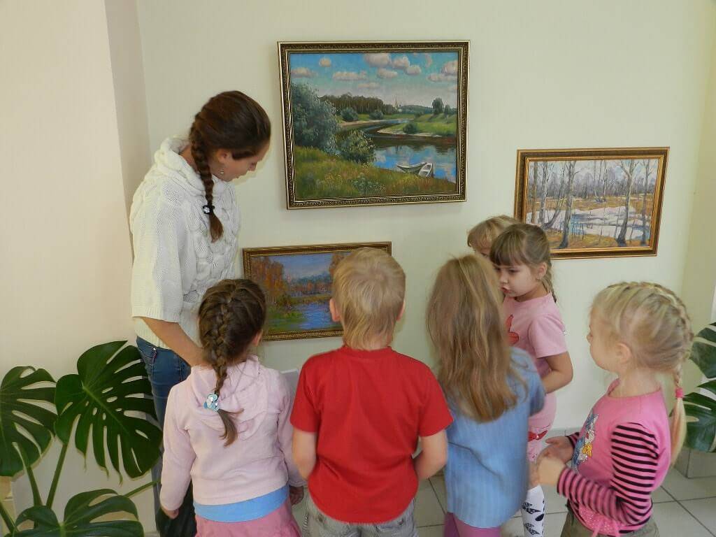 Произведения искусства можно использовать как при проведении занятий, самостоятельной деятельности, так и при оформлении помещений в дошкольном учреждении. Для разных детей подбираются произведения, соответствующие их возрасту. Подходят иллюстрации из сказок, натюрморты и пейзажи, небольшие произведения скульптуры (статуэтки из дерева, гипса), разнообразные формы декоративного искусства. Все мероприятия обязательно сопровождаются музыкой.