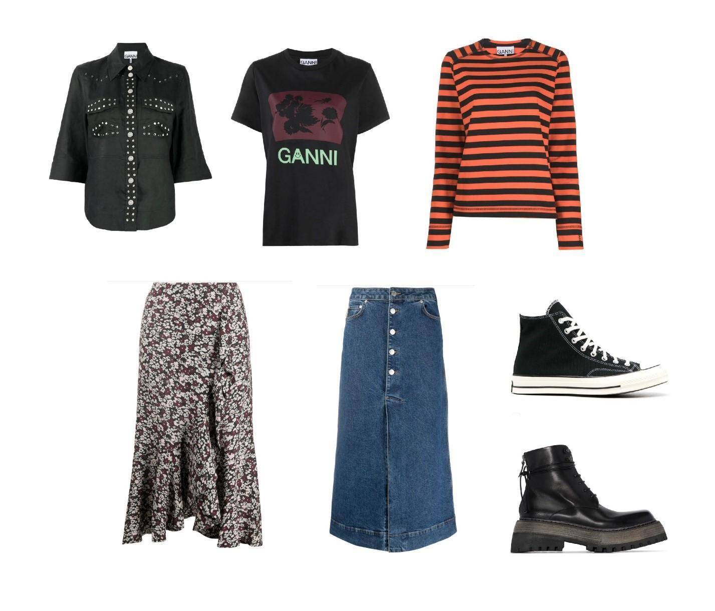 Образ 5. Юбки, футболки, рубашка GANNI, кеды Converse, ботинки Marsèll.