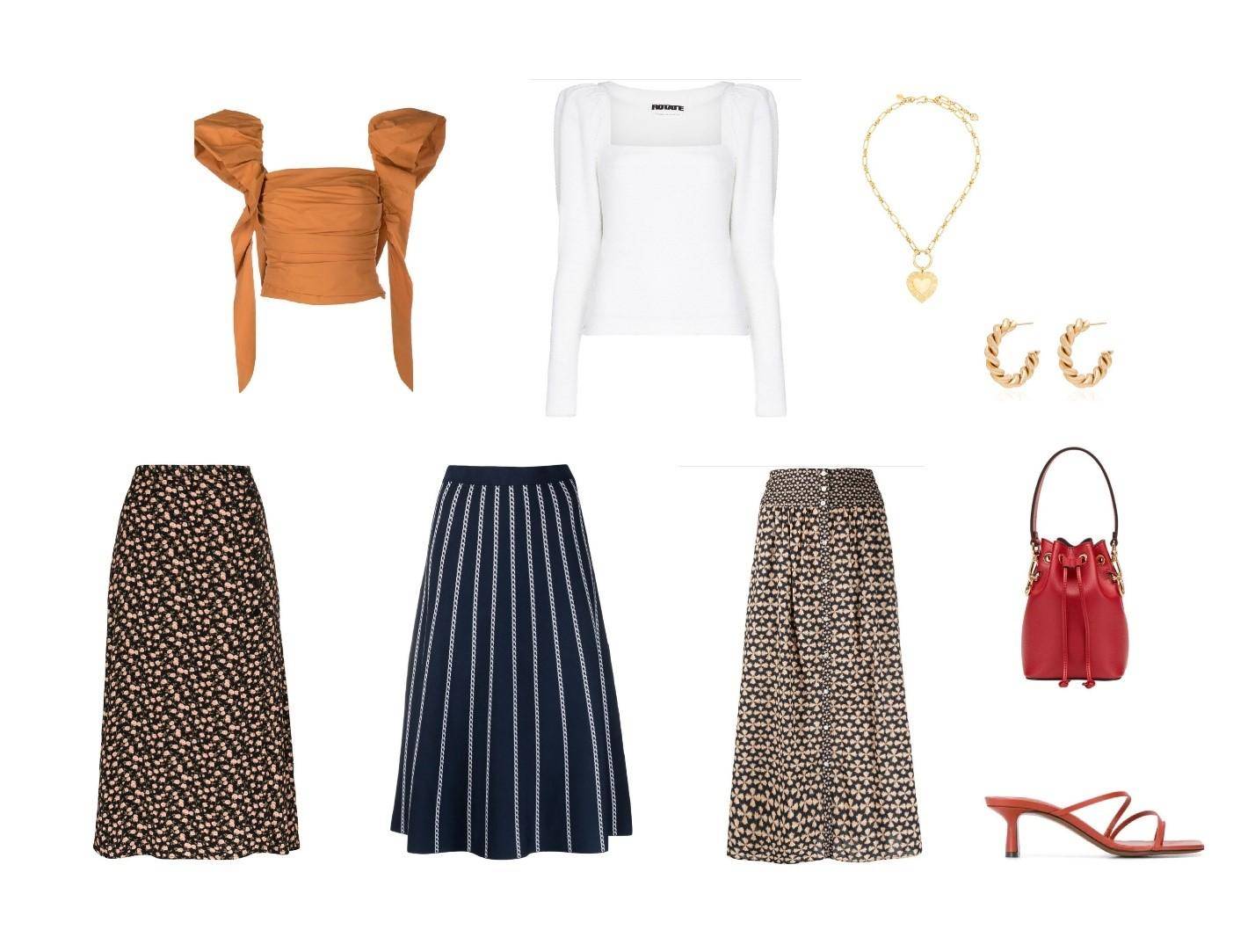Образ 1. Юбка Reformation, Ba&Sh, Michael Michael Kors, топ ROTATE, Pinko, сумочка Fendi, босоножки NEOUS, колье Brinker & Eliza, серьги Laura Lombardi.