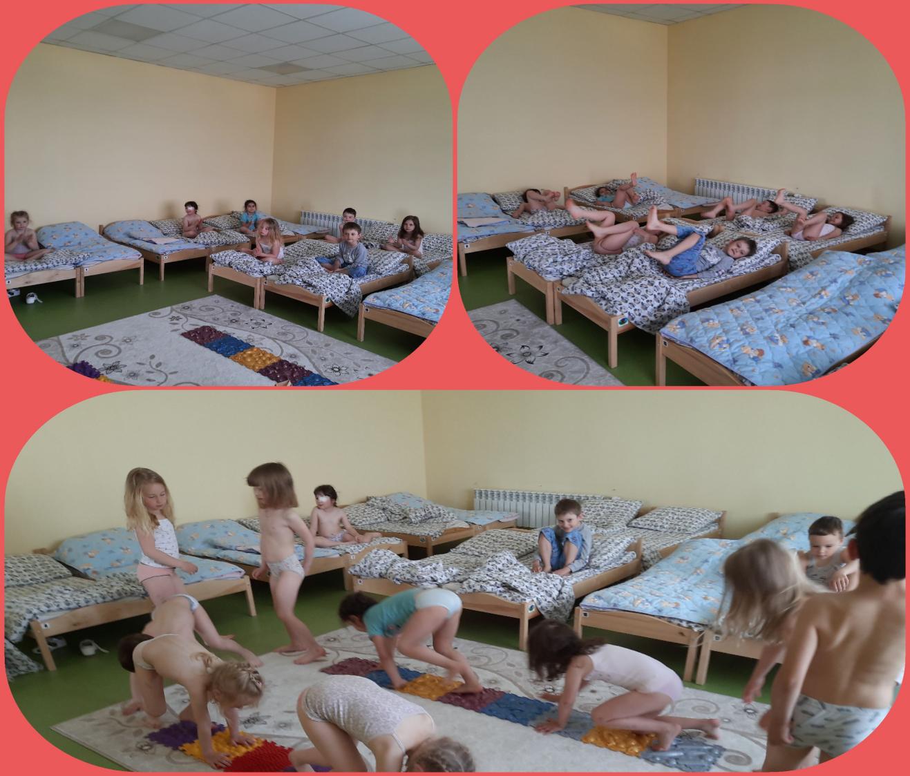 - Потягивание. Лежа в кроватях на спине, ребята протягивают руки вдоль тела, а затем вытягивают за голову и тянутся макушкой вверх, одновременно пятки тянут к противоположной спинке кровати.