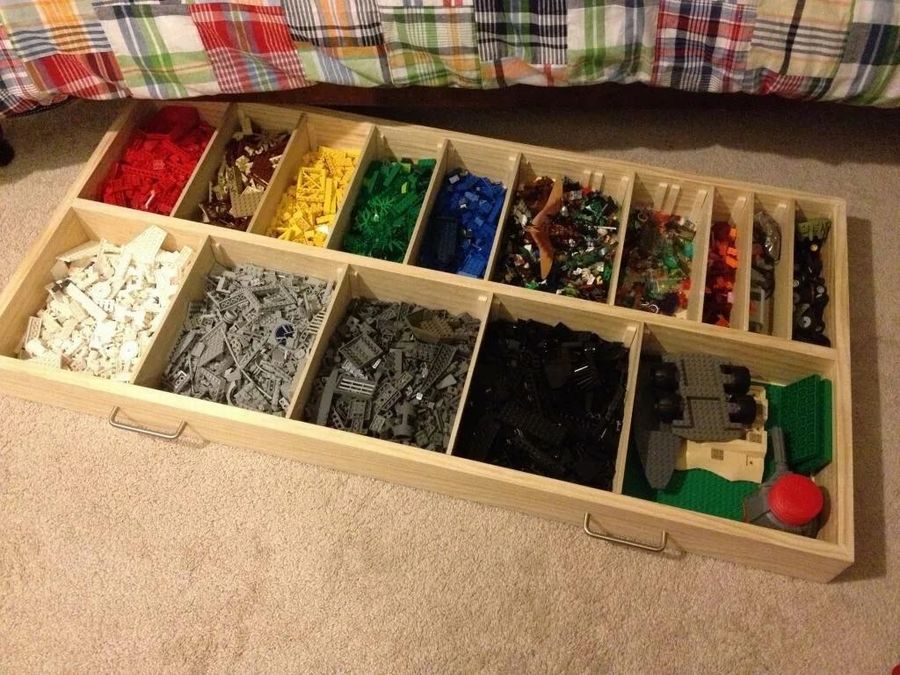 Если детская кровать имеет выдвижной ящик, то и из него можно сделать детский органайзер. Достаточно сделать разделители в ящике, и конструктор можно слаживать.