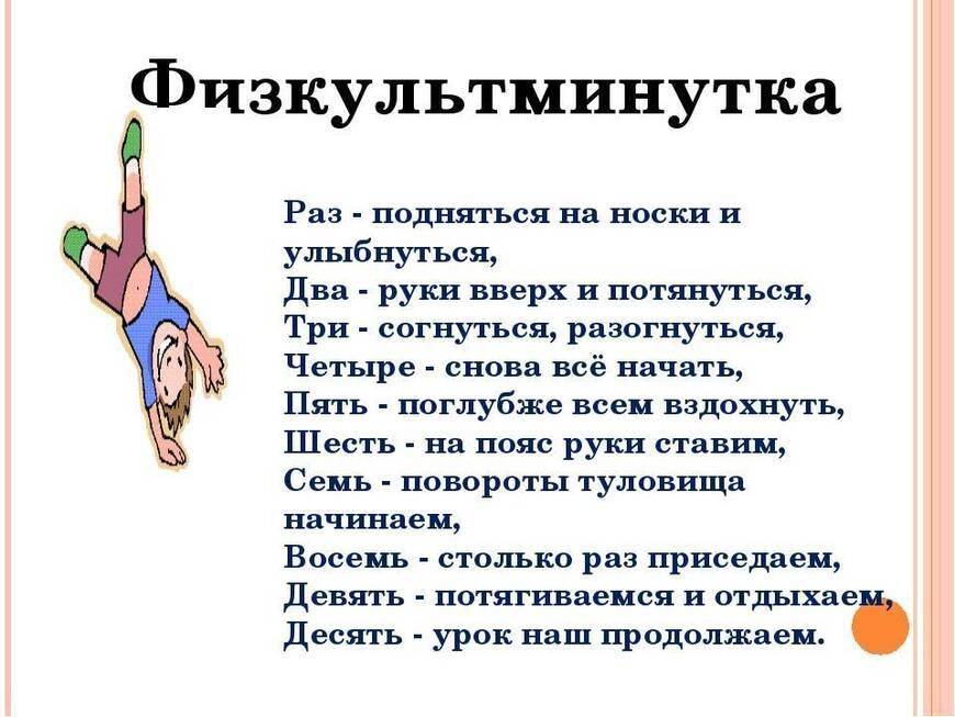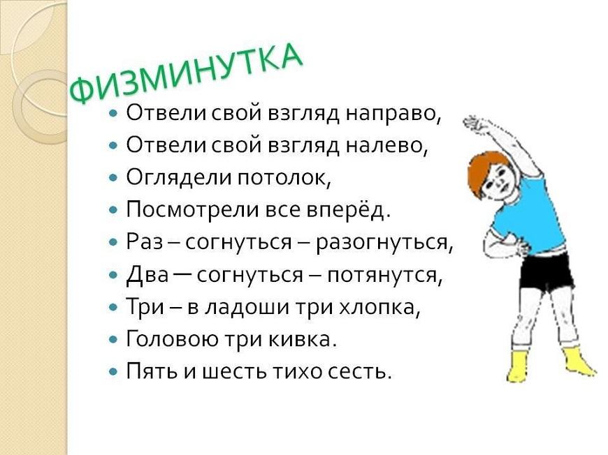 Мы по лугу прогулялись И немножко отдохнем. (Шагаем на месте Встанем, глубоко вздохнем. Руки в стороны, вперед, (Развели руки в стороны, вперед.) Чудеса у нас на свете: Стали карликами дети (Присели.) А потом все дружно встали, Великанами мы стали. (Встали.) Дружно хлопаем, (Хлопаем в ладоши.) Ногами топаем! (Топаем ногами.) Хорошо мы погуляли и нисколько не устали! (Шагаем на месте.)