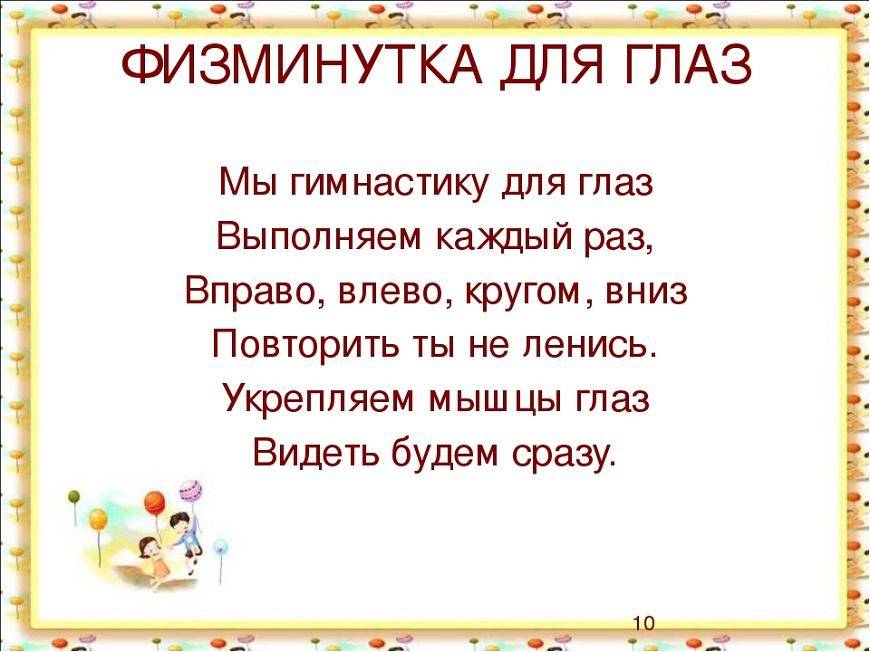 Детям дается задание посмотреть поочередно вверх, вниз, затем направо, налево. Можно также предложить им «нарисовать» глазами круг (либо букву, с которой начинается их имя). При этом можно сопровождать упражнение каким-нибудь детским стихотворением на данную тему. Например: